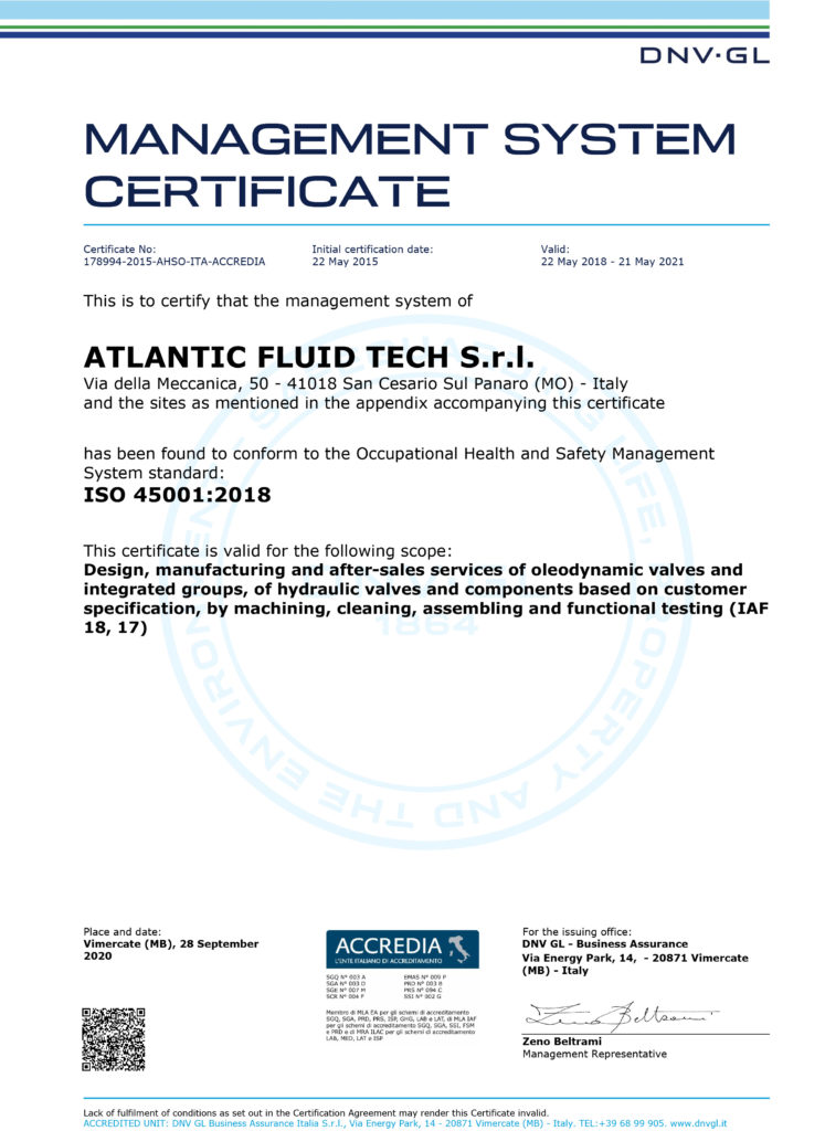 Atlantic Fluid Tech was already certified OHSAS 18001, the British Standard for Occupational Health and Safety Assessment and decided to speed up and move to the new UNI ISO 45001 standard 6 months ahead of certificate expiration. We got the certification with flying colors and without remarks